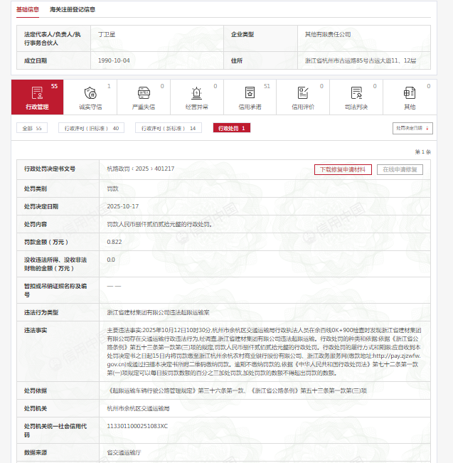 齐鲁晚报·齐鲁壹点记者于信用中国行政处罚信息栏获悉,10月17日,浙江省建材集团有限公司(下称“浙江省建材集团”)收罚单,违法行为类型为违法超限运输,处罚机关为杭州市余杭区交通运输局,处罚决定书文号:杭路政罚﹝2025﹞401217。