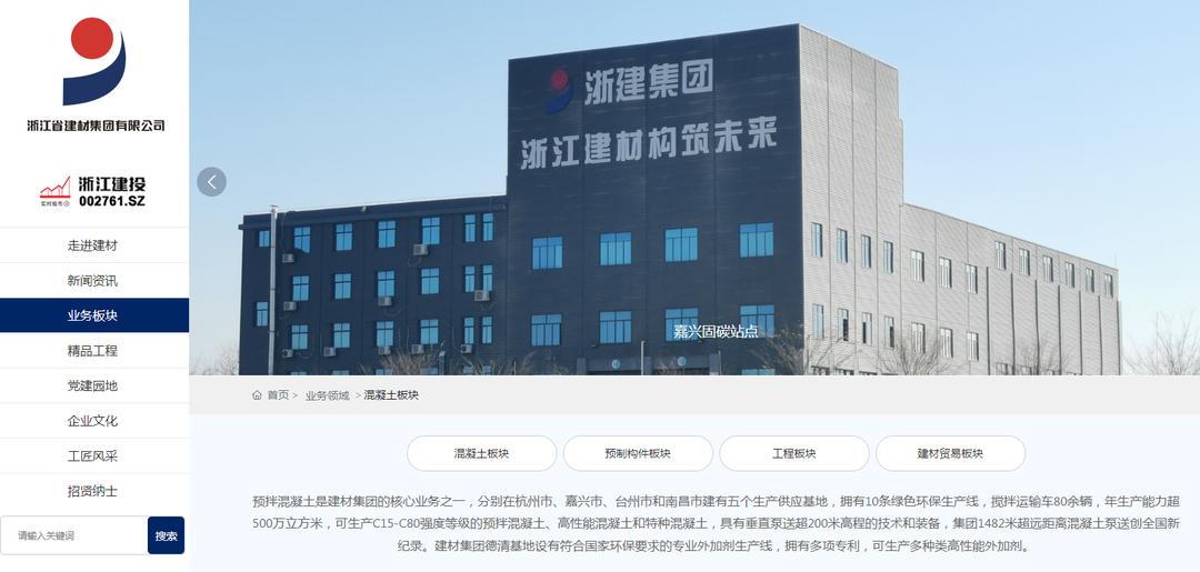 浙江省建材集团官网介绍,公司是浙江省建设投资集团股份有限公司建筑工业制造板块核心成员企业之一,是一家集原材料自制、研发、设计、生产、安装、咨询于一体的全产业链规上企业,也是浙江省较早的国字号预制构配件公司。浙江建材业务范围覆盖全国20多个省(市、区)和阿尔及利亚、斯里兰卡、马来西亚、沙特等多个国家与地区。